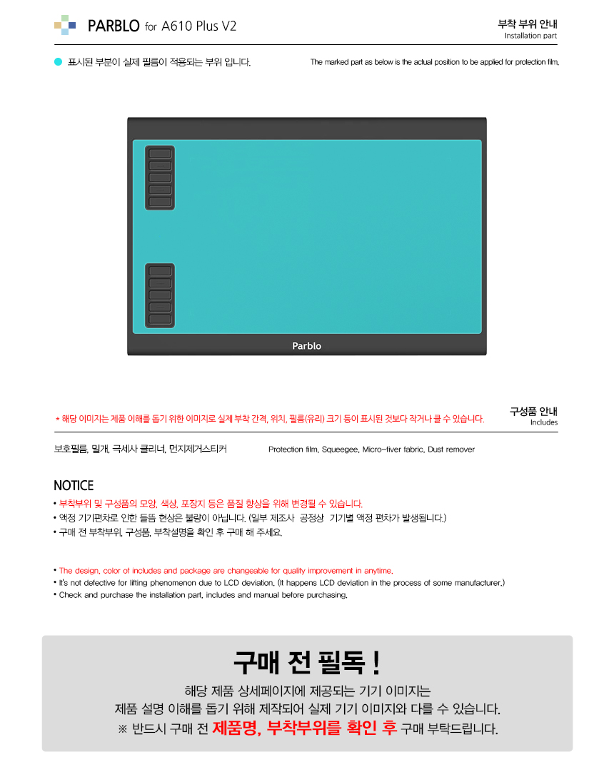 - 구성품: 보호필름, 밀개, 극세사 클리너, 먼지제거스티커