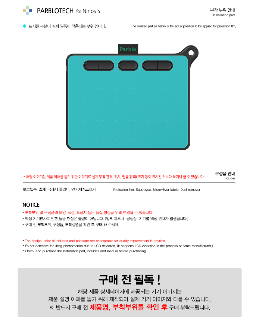 - 구성품: 보호필름, 밀개, 극세사 클리너, 먼지제거스티커